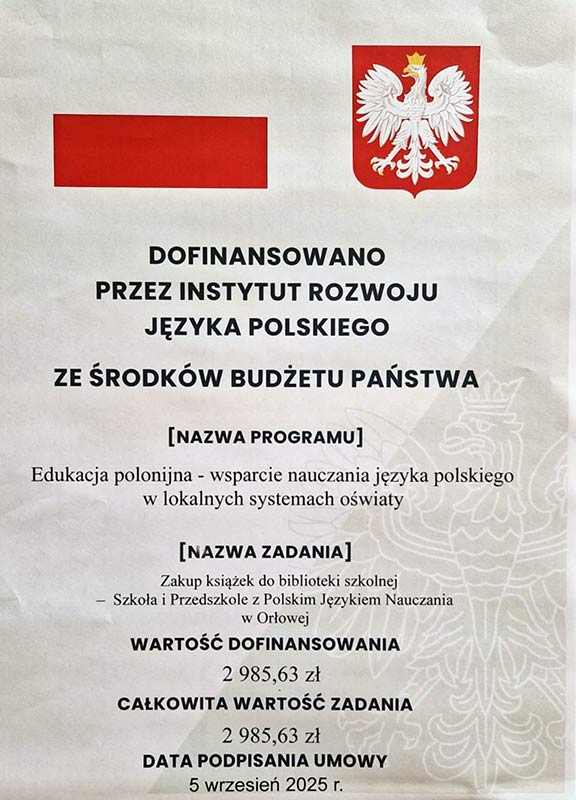Nasza placówka otrzymała finansowanie w wysokości 2985,63 zł na zakup książek, co pozwoliło wzbogacić księgozbiór o nowe, atrakcyjne pozycje dla dzieci. Czytanie odgrywa istotną rolę w rozwoju językowym, emocjonalnym i społecznym dziecka. Dzięki książkom uczniowie rozwijają wyobraźnię, poszerzają słownictwo i uczą się rozumienia świata. Cieszymy się, że możemy wspierać rozwój czytelnictwa wśród najmłodszych. Sfinansowano przez Instytut Rozwoju Języka Polskiego ze środków budżetu państwa.
